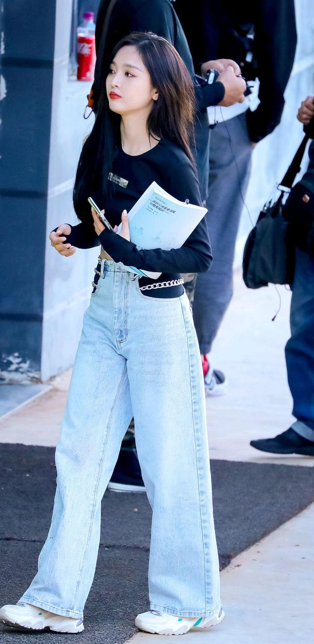 吴宣仪身上穿的这条牛仔裤还是比较宽松的直筒裤,这对身材要求不会太过挑剔,对大部分女生来说都非常的友好,特别是对一些比较特殊的人群,比如说腿部线条比较粗的女生,或者是胯比较宽的女生,也可以选择这类似牛仔裤来进行修饰。
