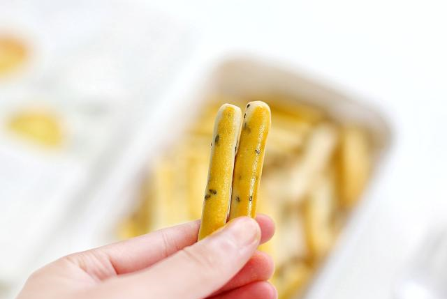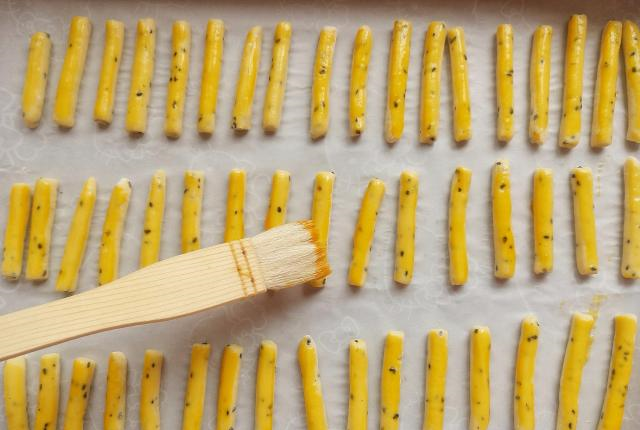 7、然后把打散的蛋黄液均匀地刷在手指条表面,这里的蛋黄液不是全蛋液,大家做的时候别搞错了
