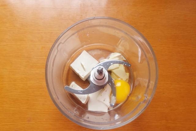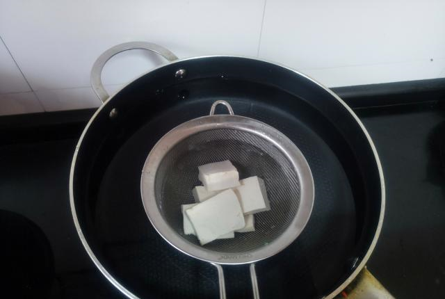 2、豆腐焯好后过一下冷水降降温,然后和鸡蛋一起倒入料理机内,搅打成糊状