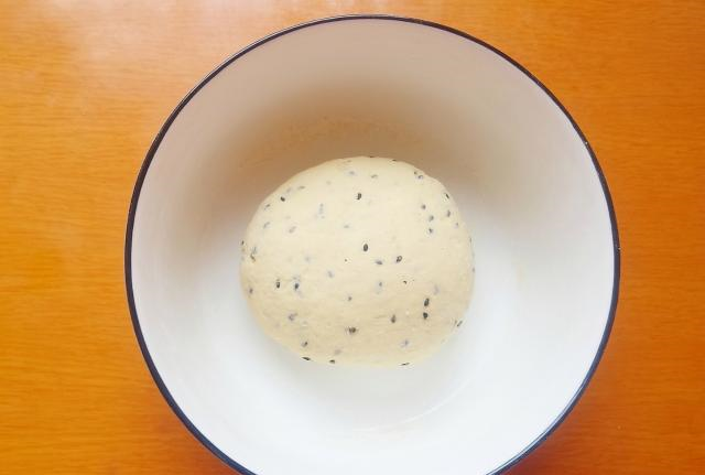 3、将打好的鸡蛋豆腐糊倒入碗内,加入低筋面粉、糖粉和黑芝麻,揉成光滑偏硬的面团。温馨提示,因为市面上卖的老豆腐含水量都不一样,再加上面粉的吸水率也不同,所以配方里低筋面粉的用量不是绝对的,如果你揉好的面团特别软,那么可以适当增加一点面粉进来