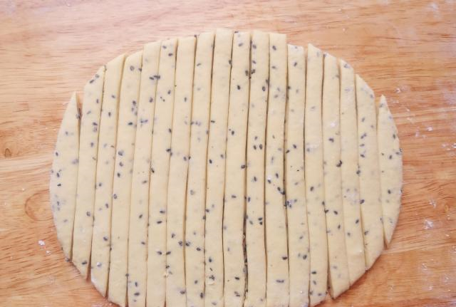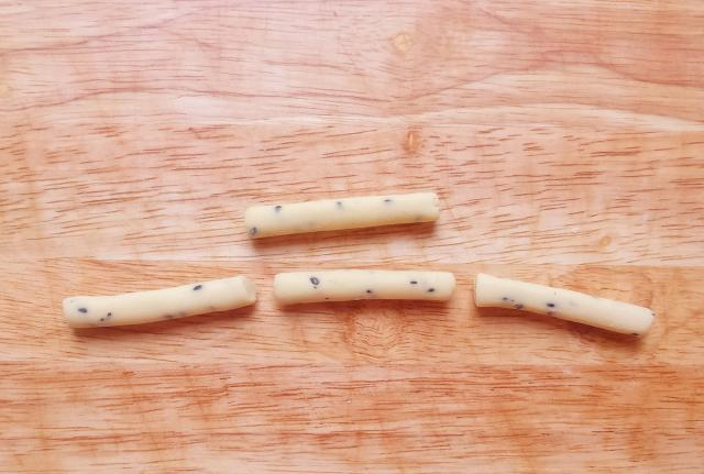 5、取一个长条,用手搓成圆柱状,搓好后用刀切成若干份。剩下的依次操作
