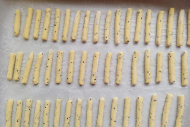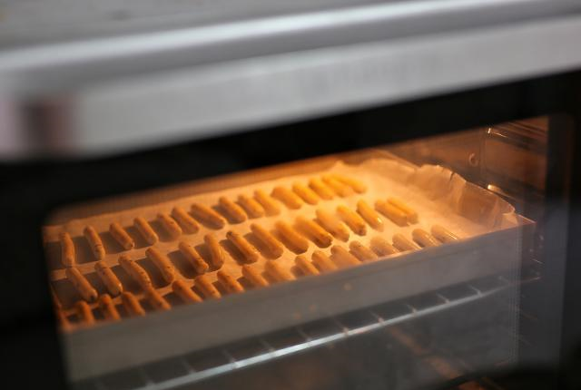 6、把所有搓好的手指条摆放在烤盘内,烤盘记得事先垫好油纸防粘,此时烤箱预热160度上下火